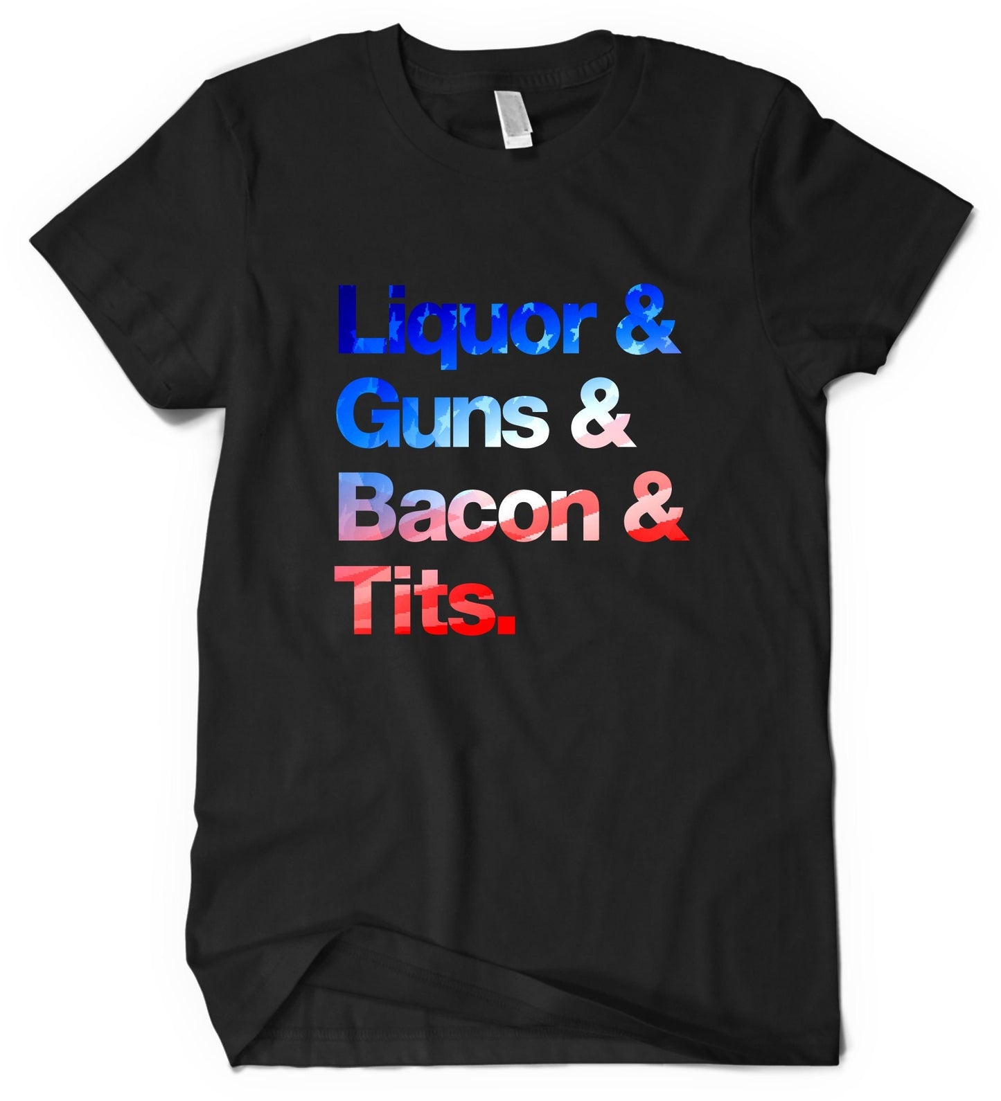 Printed with our Liquor, Guns, Bacon and Tits design, this t-shirt is super soft and comfy, with the right amount of stretch, and flattering for all body sizes.