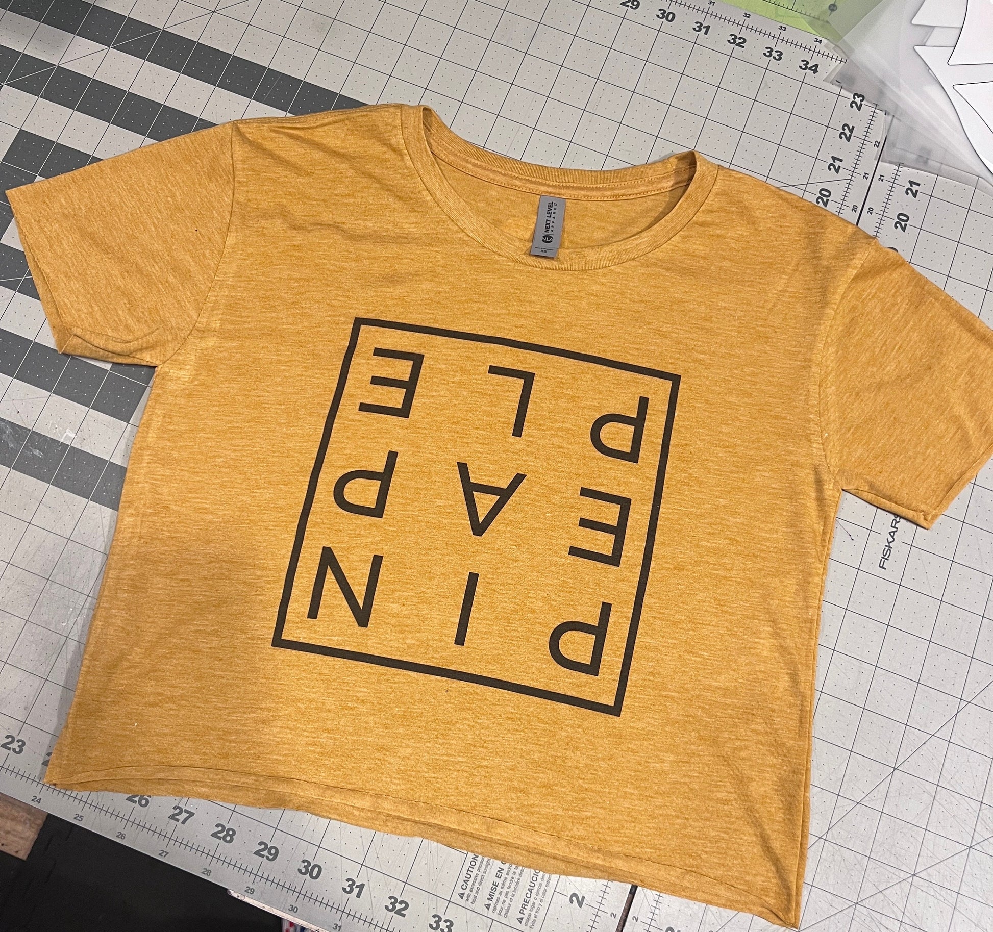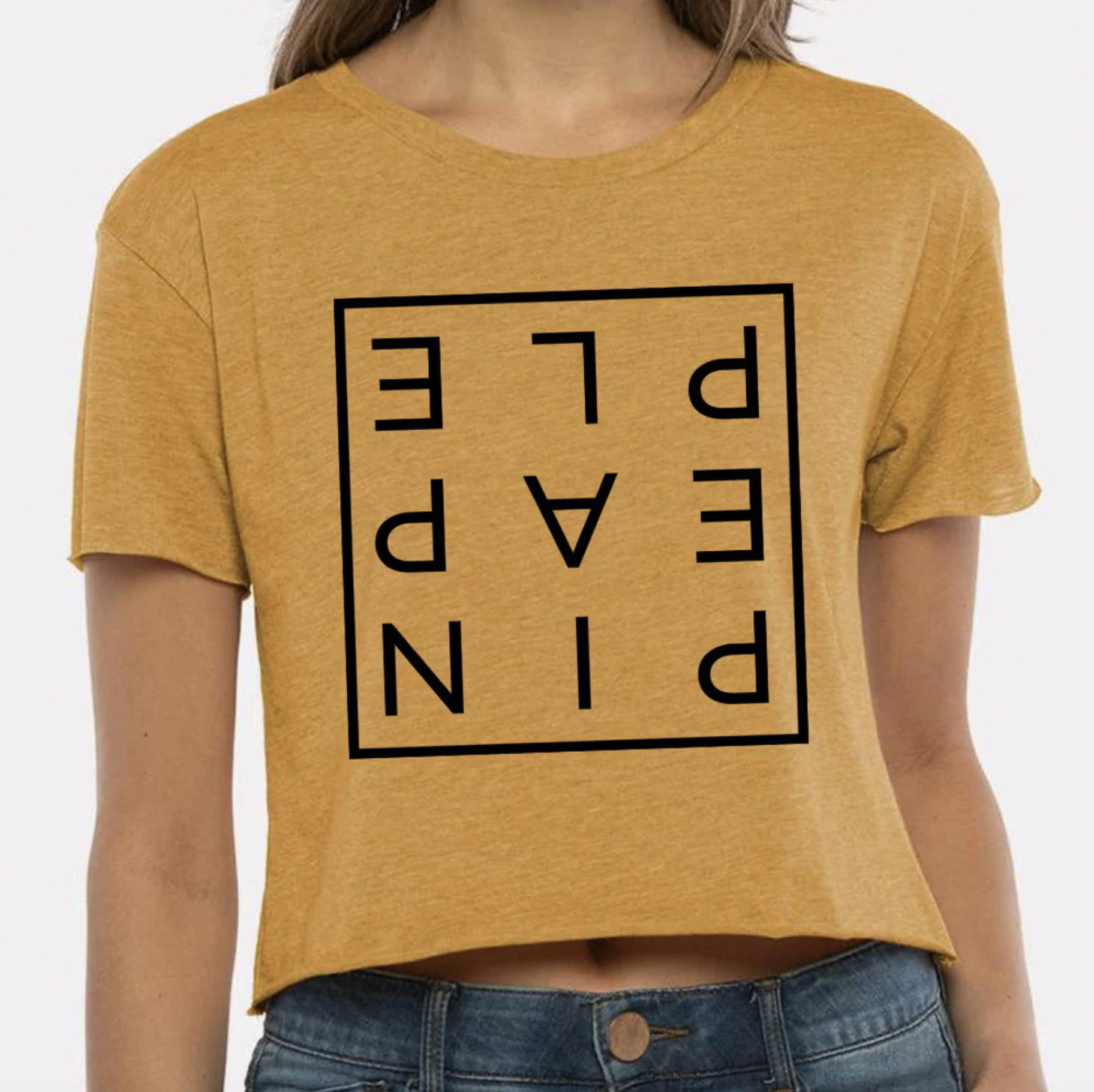 Pictured: And upside down pineapple word one a heather mustard womens crop top. The model cut the neck to make it a scoop neck to match the cut of the sleeves and lower part. super fun, super sexy, super hot